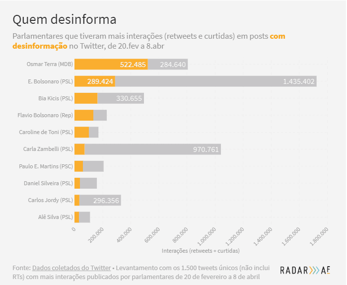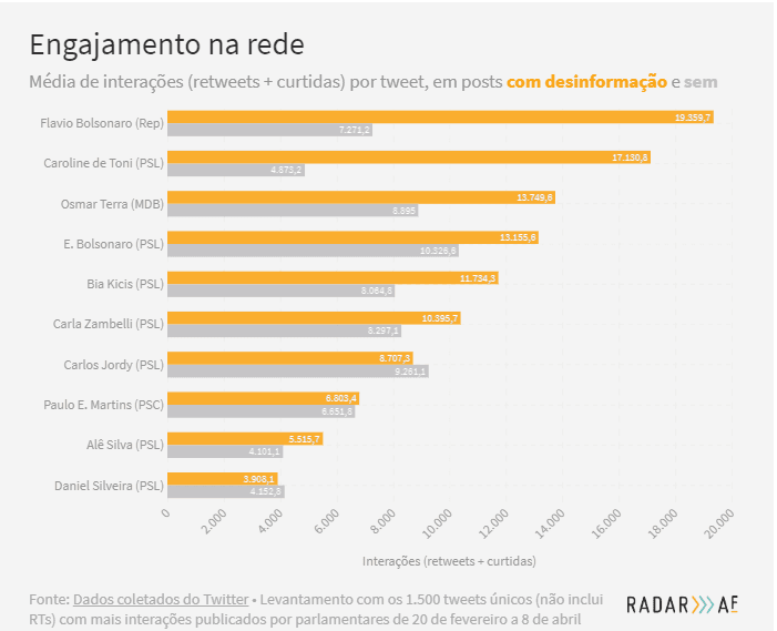 No total, foram encontradas 159 postagens com desinformação veiculadas por 22 parlamentares e que somavam cerca de 1,58 milhão de interações no período. A maioria desses parlamentares pertencem ao PSL, eleitos na onda bolsonarista nas eleições de 2018.