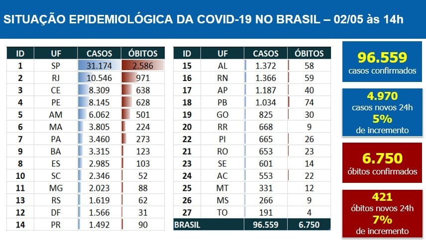 O Ministério da Saúde divulgou hoje (2) novos números sobre a pandemia do novo coronavírus (Covid-19) no país. De acordo com levantamento diário feito pela pasta, o Brasil tem 96.559 casos confirmados da doença e 6.750 mortes foram registradas. A taxa de letalidade está em 7%. Nas últimas 24 horas, o ministério registrou 4.970 novos casos e 421 mortes. Veja o infográfico das 14 horas logo abaixo.