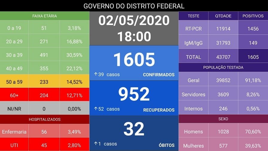 No Distrito Federal, a informação de hoje à noite é que 32 pessoas morreram por conta do vírus. Há 1.605 casos registrados. Veja o infográfico logo abaixo. No mundo, tem mais de 3,4 milhões de casos confirmados e 242 mil mortes.