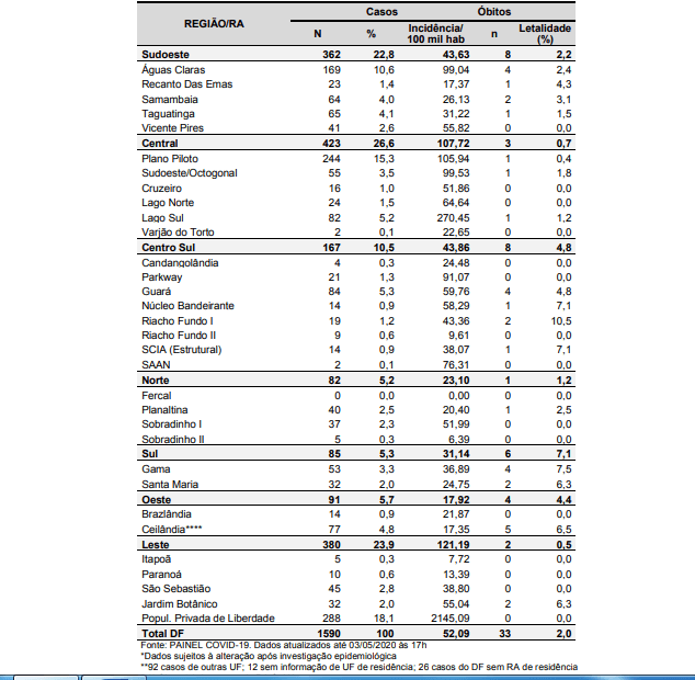 Até às 17 horas deste domingo, foram confirmados 1.720 casos, com incremento de 115 casos novos em relação ao dia anterior. Do total de casos confirmados, 108 estão hospitalizados – 49 em Unidade de Terapia Intensiva e 33 foram a óbito, o que representa uma letalidade (proporção de óbitos em relação ao total de casos confirmados) de 1,9%, no Distrito Federal.