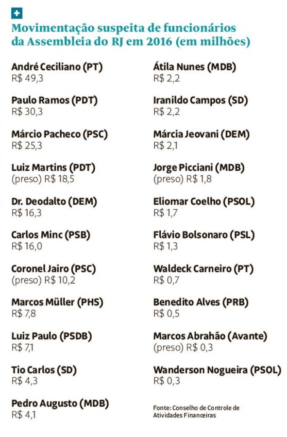 O deputado Eduardo Bolsonaro (PSL-SP) também comentou o assunto no Twitter. Aproveitou para retuitar uma lista de partamentares envolvidos na investigação das rachadinhas. “Realmente é um fato no mínimo intrigante…”. Veja a lista postada por Eduardo logo abaixo.