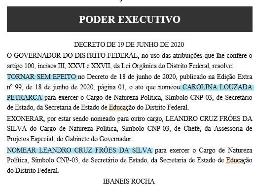 Em menos de um dia, o governador do Distrito Federal, Ibaneis Rocha (MDB) trocou duas vezes o secretário da Educação. Ontem tinha sido exonerado “a pedido”, João Ferraz. Na sequência, foi nomeada a advogada Carolina Petrarca Louzada. Hoje, ela foi exonerado segundo um novo decreto publicado na edicção extra do Diário Oficial do DF. Em seu lugar foi indicado Leandro Cruz Fróes da Silva.