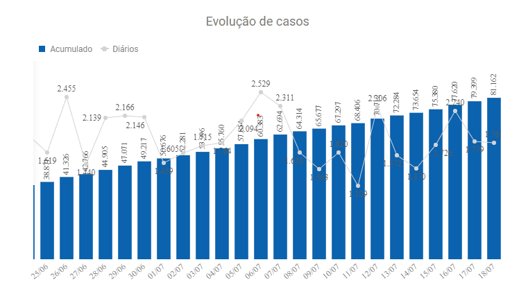 No total, o Distrito Federal apresentou nas últimas 24 horas 1.763 novos casos, com um crescimento de 1,3% no número de mortos. Até agora foram registrados 1075 óbitos, dos quais 65 entre ontem e hoje. Depois de Ceilândia, a região administrativa com mais casos é o Plano Piloto com 6.110, seguido de Taguatinga com 5.630 e Samambaia com 5.424 casos. Veja quadro evolutivo na tabela abaixo.