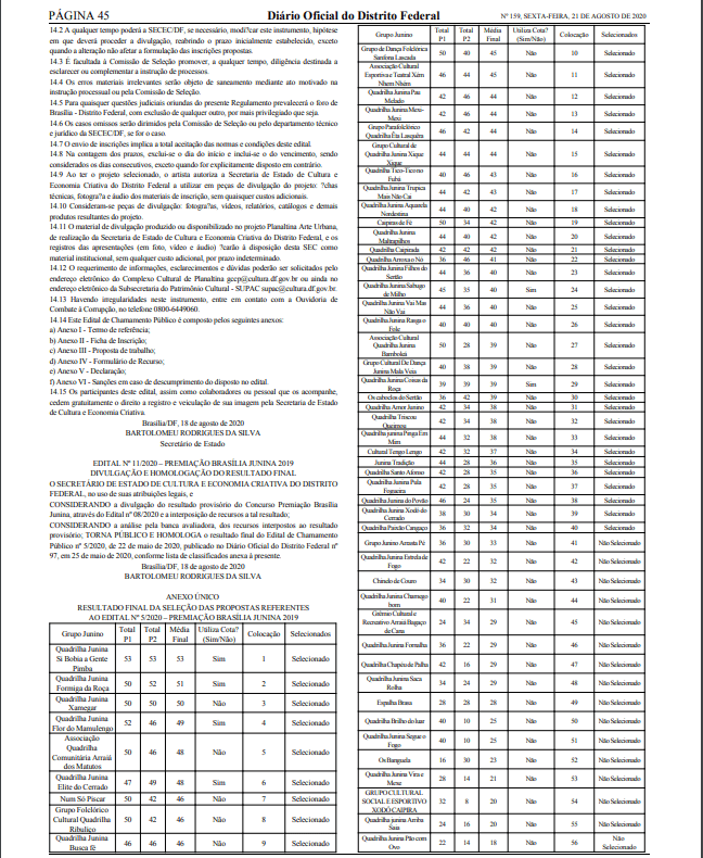O resultado final do edital de premiação foi publicado nesta sexta-feira (21), no Diário Oficial do Distrito Federal, página 42. O recurso foi destinado aos grupos que participaram dos festejos regionais no ano passado como reconhecimento às suas trajetórias. No total, 57 grupos foram inscritos, com 70% beneficiados.