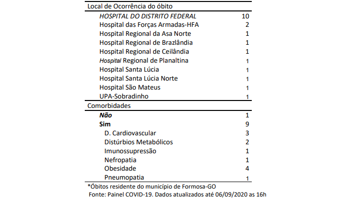 O Distrito Federal não teve notificação de óbitos ocorridos entre ontem e hoje, de acordo com a Diretoria de Vigilância Epidemiológica do Distrito Federal. O boletim médico, no entanto, registrou dez mortes ocorridas entre 5 de agosto a 7 de setembro. A falta de notificação de morte nas últimas 24 horas pode ser explicada pela subnotificação que ocorre sempre nos finais de semana e no feriadão, esse detalhe pode ter se acentuado.