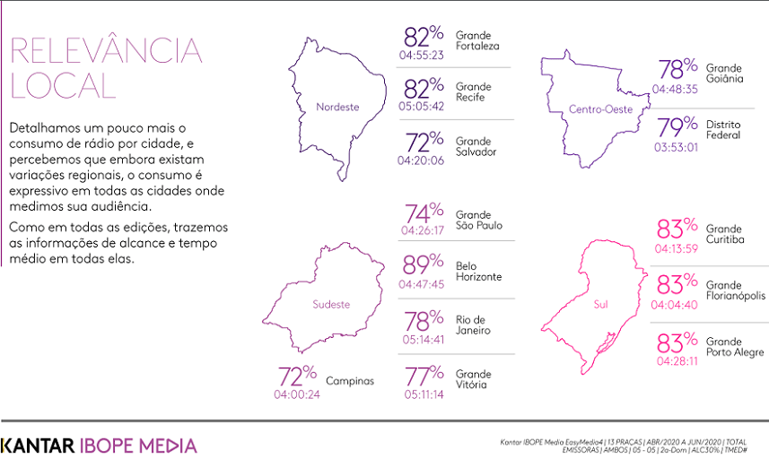 O brasiliense dedica, em média, 4 horas para ouvir os programas das rádios noticiosas e musicais. O alcance da audiência é de 79%. A pesquisa estratificada pelas cinco regiões brasileiras foi divulgada hoje (30) pela Kantar Ibope Media, que lançou a edição 2020 do Inside Rádio. O levantamento considera a adaptação do rádio para a web e as novas formas de consumo de áudio (como podcasts e conteúdo on demand).
