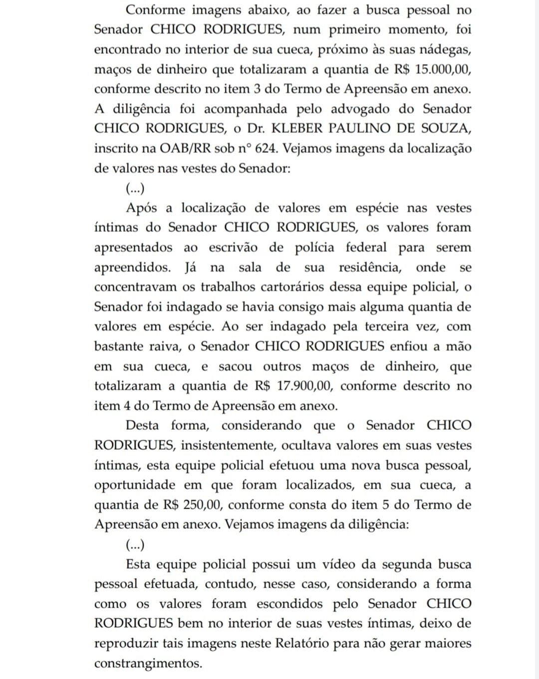 O delegado que chefiava o cumprimento das buscas na casa do senador Chico Rodrigues (DEM-DF) foi quem promoveu a revista pessoal no político que estava de shorte. Ele relatou esse fato no relatório apresentado ao ministro do Supremo Tribunal Federal, Luís Roberto Barroso. A revista no senador foi filmada, mas os vídeos estão sob segredo e guardados num cofre por determinação do ministro que considerou, assim como o policial, imagens constrangedoras.