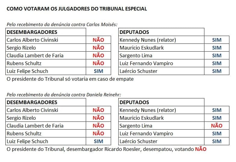 Na votação do processo contra a vice-governadora, Daniela Reinehr (sem partido), houve empate. A decisão de prosseguir com a denúncia ficou nas mãos do presidente do Tribunal de Justiça de Santa Catarina. O desembargador Ricardo Roesler a rejeitou a denúncia. Daniela assumirá como governadora interina na próxima terça-feira.