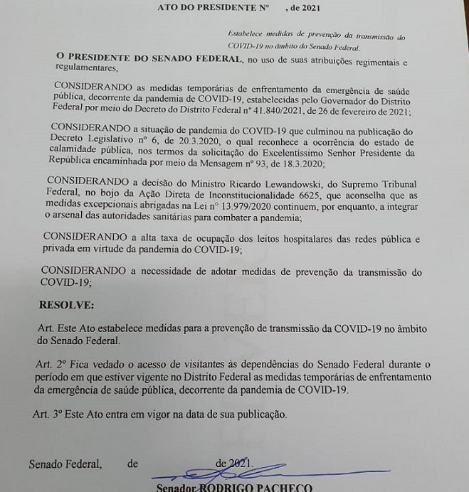 A partir de segunda-feira (01), o acesso ao Congresso Nacional estará proibido para os visitantes, segundo norma já publicada pelo Senado Federal e assinada pelo presidente Rodrigo Pacheco (DEM-MG). A Câmara dos Deputados deve publicar a sua norma restritiva provavelmente neste final de semana, comentou há pouco o vice-presidente Marcelo Ramos (PL-AM).