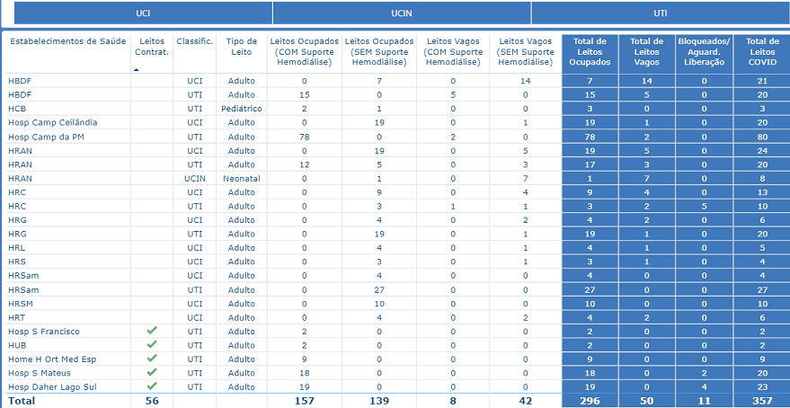 O Distrito Federal confirmou sete mortes e 1.079 novos casos neste domingo (28). O total de óbitos chega a 4.838, e os infectados somam 296.694. De acordo com a Secretaria da Saúde, o número de novos casos é 53,2% maior que o registrado no sábado (27). Na mesma comparação, o número de mortes caiu 41,6%. Foram 12 vítimas no dia anterior. A ocupação de leitos de UTI por pacientes com Covid-19 chegava a 85,55%.