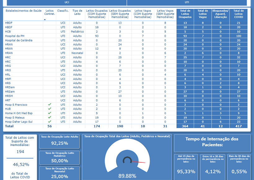De acordo com a Secretaria da Saúde, o Distrito Federal ultrapassou hoje a marca de 5.002 mortes associadas ao novo coronavírus. Somente nesta terça-feira (09), foram registradas 23 mortes. A média de óbitos dos últimos sete dias ficou em 16,4. Houve alta de 57,7% na comparação com a média de 14 dias para trás. O índice de recuperados é de 93,8%, mas há mais de 20 mil casos ativos. Veja logo abaixo o quadro da ocupação dos leitos de UTIs.