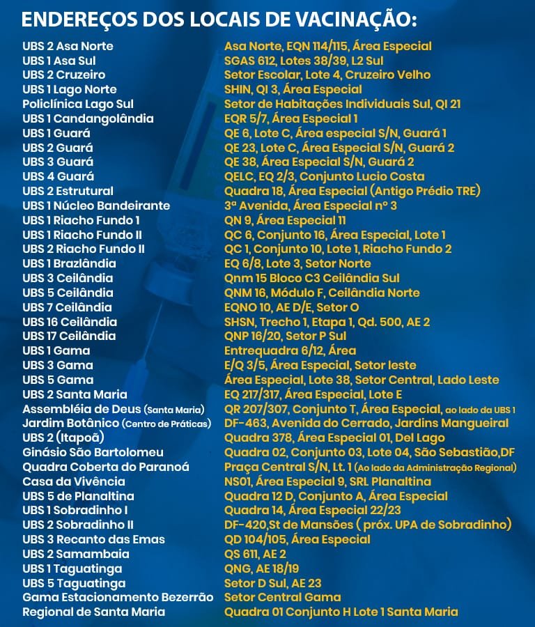 A Secretaria de Saúde definiu os pontos de vacinação contra a Covid-19 que estarão abertos no próximo domingo (21). São três locais: Estacionamento 13 do Parque da Cidade, Shopping Iguatemi e Faculdade Unieuro (Águas Claras). Esses mesmos postos também funcionarão aos sábados para receber o público que não conseguiu se vacinar ao longo da semana.