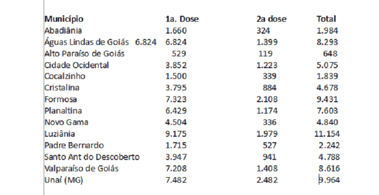 No total, somente 7,23% da população foi vacinada na primeira dose e 2% da população na segunda dose. O Entorno do DF possui cerca de 1 milhão de habitantes.
