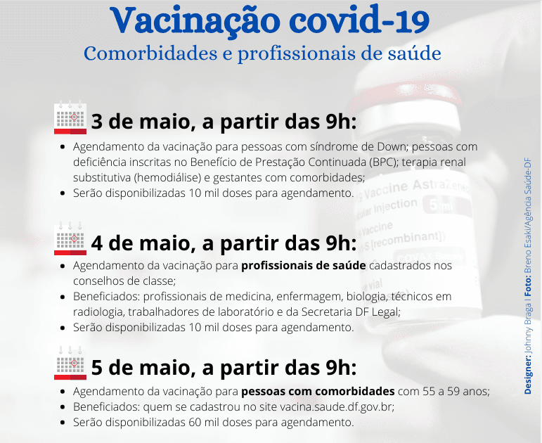 Através do site pessoas com síndrome de Down, com deficiência cadastradas no Benefício de Prestação Continuada (BPC), pacientes que fazem terapia renal substitutiva (hemodiálise) e gestantes com comorbidades poderão agendar o recebimento da primeira dose da vacina.