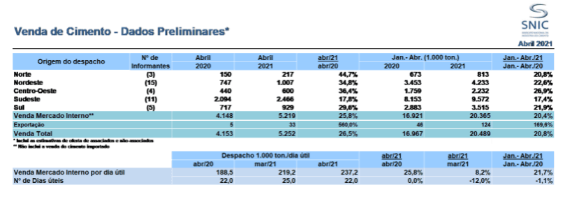 De acordo com a entidade, o mês de abril seguiu a tendência do primeiro trimestre do ano e contou com um volume de vendas de 5,3 milhões de toneladas de cimento, 26,5% a mais do que abril do ano passado. No acumulado de janeiro a abril, o crescimento no país foi de 20,8% em relação ao mesmo período de 2020.