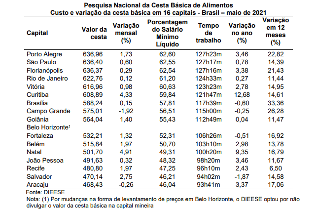 Entre as capitais analisadas, a cesta mais cara foi a de Porto Alegre, onde o custo médio dos produtos básicos somou R$ 636,96. Em seguida aparecem São Paulo (R$ 636,40), Florianópolis (R$ 636,37) e Rio de Janeiro (R$ 622,76). A cesta mais barata foi a de Aracaju, cujo preço médio encontrado foi de R$ 468,43. Com base na cesta mais cara, registrada em Porto Alegre, o Dieese estimou que o salário mínimo do país deveria ser de R$ 5.351,11, valor que corresponde a 4,86 vezes o piso nacional vigente, de R$ 1.100,00.