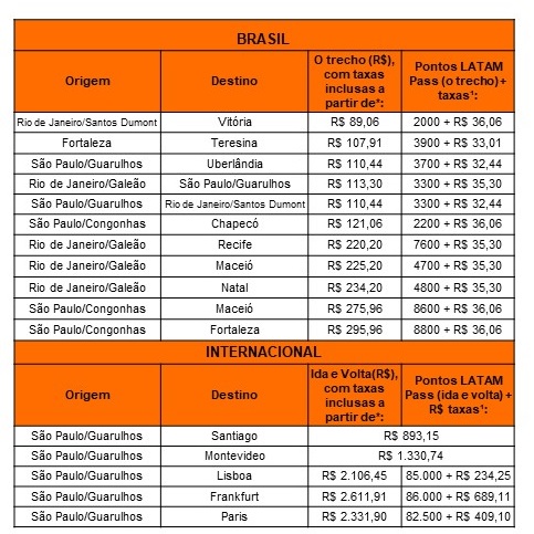 A Latam Brasil começou hoje uma promoção de preços de passagens aéreas para 16 destinos, dos quais cinco para o exterior, como de São Paulo para Paris. De acordo com informações da empresa ao site Misto Brasília, a menor tarifa é para o voo entre Rio de Janeiro/Santos Dumont e Vitória, a partir de R$ 89,06.