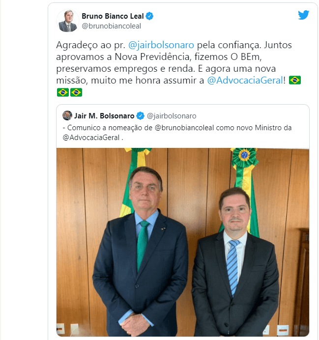 Ele será o terceiro advogado-geral da União sob Bolsonaro. Bianco era o secretário-executivo do Ministério do Trabalho