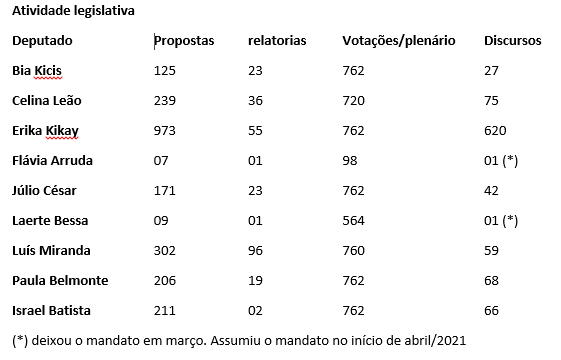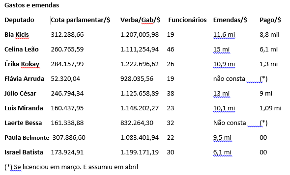 O Misto Brasília elaborou dois quadros que espelham um resumo das atividades parlamentares da bancada do DF. No primeiro quadro, estão as atividades legislativas, própria para o exercício parlamentar. No segundo, estão os gastos e as propostas de emendas parlamentares. Quem é da base do governo teve vantagem no pagamento das emendas, como foi o caso de Júlio César.