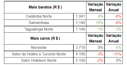 O preço médio mensal do aluguel no Distrito Federal fechou em R$ 2.770, subindo 0,3% no mês. Nos últimos 12 meses, o valor médio aumentou 2,2%, abaixo da inflação e bem abaixo do ajuste do Índice Geral de Preços – Mercado (IGP-M).