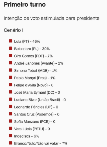 Nos três cenários de primeiro turno testados, Lula da Silva venceria no primeiro turno. A pesquisa foi registrada no Tribunal Superior Eleitoral (TSE) sob o protocolo BR-03552/2022.