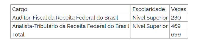 A Secretaria Especial da Receita Federal do Brasil foi autorizada a realizar o concurso público para abertura de 699 cargos do quadro de pessoal. A portaria autorizativa foi publicada hoje (13) no Diário Oficial da União para auditor fiscal e analista tributário.
