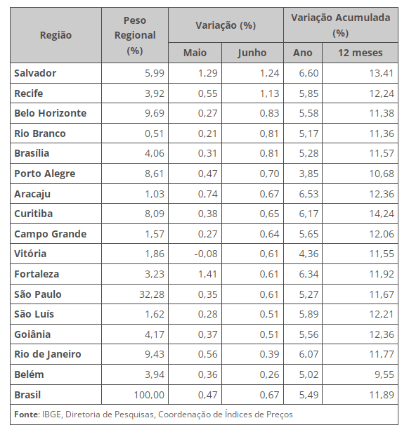 Regionalmente, todas as áreas tiveram variação positiva em junho. O maior resultado foi observado na região metropolitana de Salvador (1,24%), influenciado pela alta de 4,63% nos preços da gasolina. A menor variação ocorreu em Belém (0,26%), por conta da redução de 10,35% nos preços do açaí.