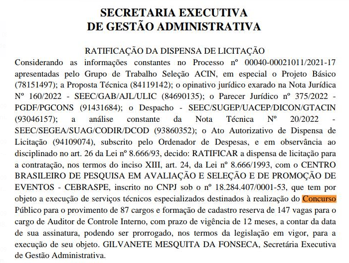 A banca vai organizar o certame para contratação de 87 auditores de controle interno e mais 157 cargos de reserva. O documento publicado confirma a dispensa de licitação.