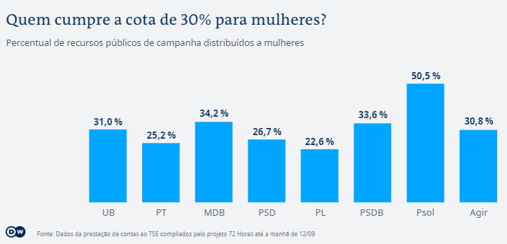 Passadas quatro semanas desde o início da campanha eleitoral, a DW compilou dados de oito partidos – Agir, MDB, PL, PSD, PSDB, Psol, PT e União Brasil – e constatou que três deles ainda não repassaram a cota mínima de 30% de recursos do fundão eleitoral a mulheres: PT, o segundo maior beneficiário de verbas públicas de campanha, o PSD e o PL, do presidente Jair Bolsonaro.