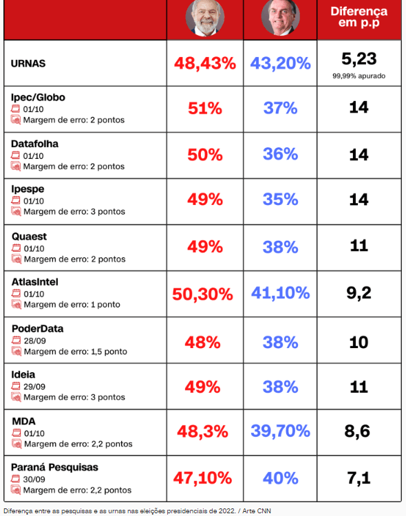 A equipe da redação da CNN Brasil fez um comparativo dos principais institutos de pesquisa com o resultado das eleições presidenciais.