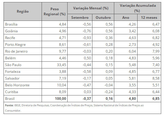 Segundo o IBGE, nove das 11 áreas pesquisadas tiveram variações positivas em outubro. A maior variação ocorreu em Brasília (0,56%), influenciada pela alta nos preços das passagens aéreas (37,59%). A menor variação foi registrada em Curitiba (-0,24%), puxada pela queda da gasolina (-6,58%).