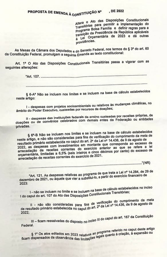 Deve ser entregue somente na sexta-feira (18) o texto final da PEC da Transição (ou Bolsa Família). No início da noite de hoje (16), o vice-presidente eleito, Geraldo Alckmin (PSB) entregou uma minuta do texto da proposta que será analisada primeiro pelo Senado e depois apensada a um outro texto que está em tramitação na Câmara dos Deputados, a PEC 24. Veja a sugestão logo abaixo.