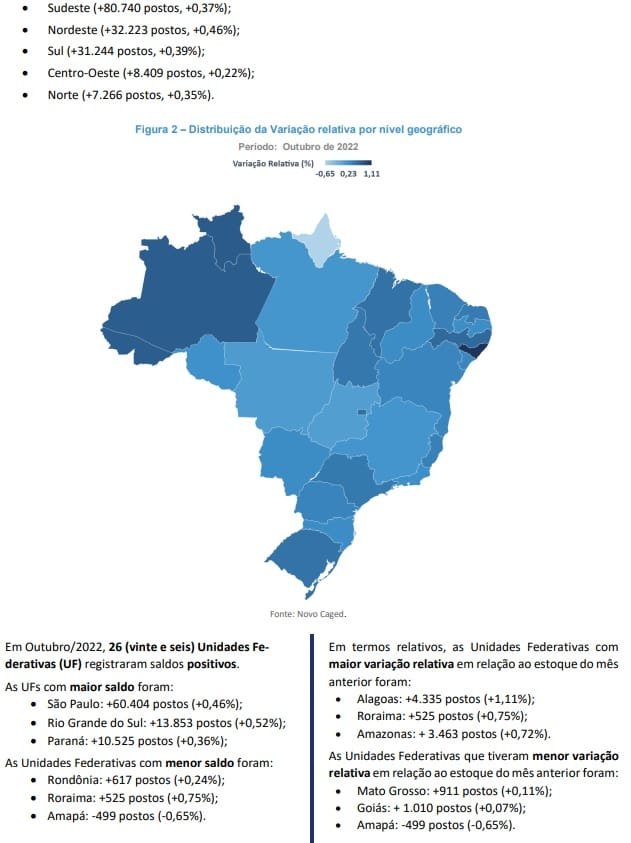 Todas as regiões do país tiveram saldo positivo na geração de emprego no mês passado. Houve aumento de trabalho formal em 26 das 27 unidades da federação. O Distrito Federal registrou o melhor desempenho na região Centro-Oeste, com uma variação positiva de 0,55%.
