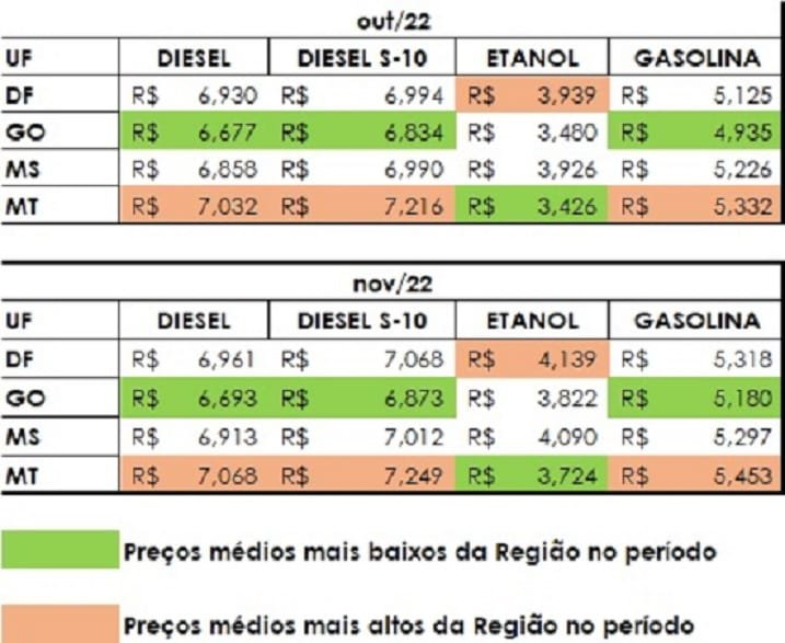 A região Centro-Oeste registrou a maior alta do país para o etanol em novembro. Foi comercializado a R$ 3,94, ante os R$ 3,69 de outubro. Veja o quadro comparativo logo abaixo.