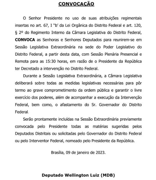 A Câmara Legislativa do Distrito Federal deverá realizar a partir das 15 horas, uma sessão extraordinária. A reunião foi convocada pelo presidente, deputado distrital Wellington Luiz (MDB). Veja a convocação logo abaixo.