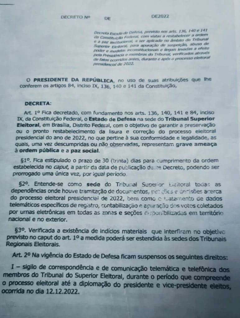 Veja o que diz a proposta de decreto encontrado com Anderson Torres