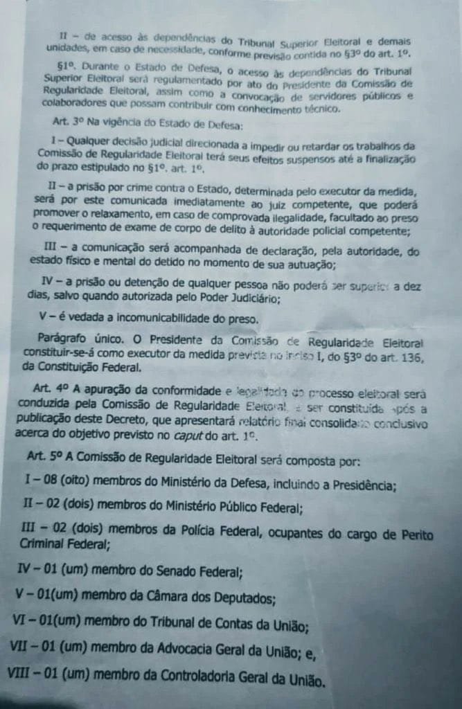 Torres afirma que a minuta seria descartada, triturada “oportunamente”. Ele acrescenta ainda que o material está sendo usado para “alimentar narrativas falaciosas” contra ele. Um dos advogados que representa o ex-ministro pontuou que a autoria não é dele.
