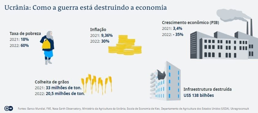 A situação econômica também é catastrófica. De acordo com o Banco Mundial e o Ministério da Agricultura da Ucrânia, o Produto Interno Bruto (PIB) do país encolheu 35% em 2022. Sessenta por cento da população vive agora na linha da pobreza. A destruição da infraestrutura doméstica pela guerra é estimada em mais de 130 bilhões de euros.