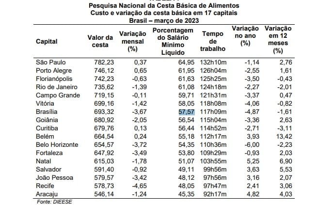 As maiores quedas no custo da cesta básica ocorreram em Recife (-4,65%), Belo Horizonte (-3,72%), Brasília (-3,67%), Fortaleza (-3,49%) e João Pessoa (-3,42%). Houve aumento no preço das cestas de Porto Alegre (0,65%), São Paulo (0,37%), Belém (0,24%) e Curitiba (0,13%).