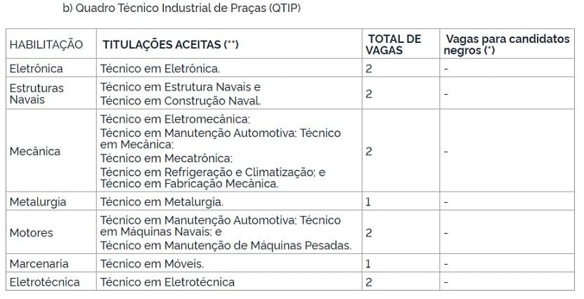 O edital foi publicado nesta quarta-feira (17) no Diário Oficial da União. O documento informa que Corpo Auxiliar de Praças tem a finalidade de atender aos encargos do interesse da Marinha, relacionados com as atividades técnicas ou administrativas das organizações militares, de acordo com as suas necessidades e as habilitações e qualificações pessoais das praças.