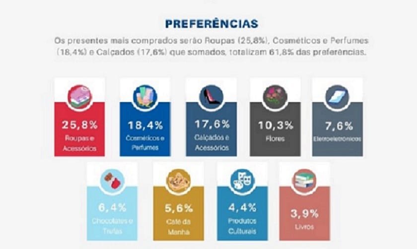 A preferência aponta as roupas/acessórios (25,8%); cosméticos/perfumes (18,4%) e calçados/acessórios (17,6%) como os itens mais visados para presentear. Na sequência, flores (10,3%); eletrônicos (7,6%); chocolates/trufas (6,4%); café da manhã (5,6%); produtos culturais (4,4%) e livros (3,9%).