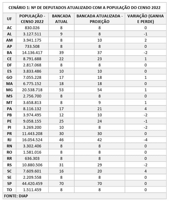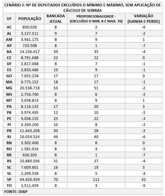 O Diap fez os cálculos em dois cenários de número de deputados por estado.