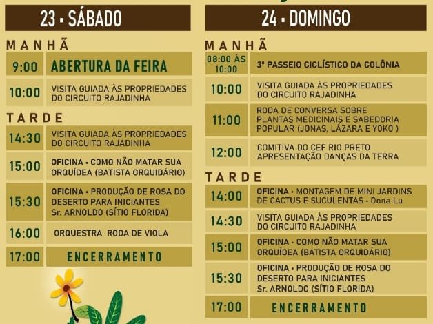 O Circuito Turístico da Colônia Agrícola Rajadinha, em Planaltina, realiza neste final de semana (dias 23 e 24) a 8ª Feira da Colônia. O evento começa às 8 horas e termina às 18 horas.