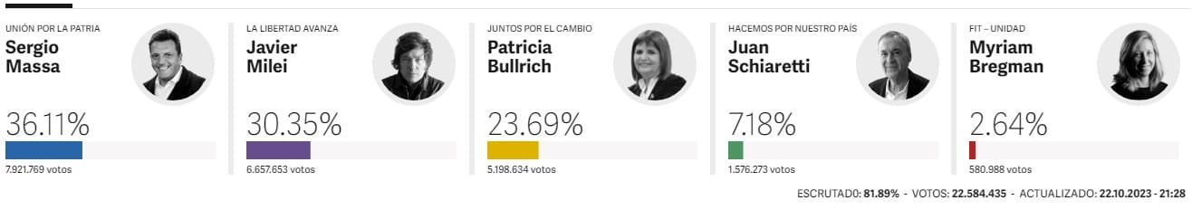 Com 81,89% das mesas apuradas, o peronistasegue na frente. O ultra direitista Javier Milei, considerado favorito nas pesquisas, fica em segundo lugar. A conservadora Patricia Bullrich está em terceiro.