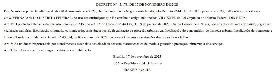 O decreto foi publicado na edição extra do Diário Oficial do DF nesta sexta-feira (17). Em janeiro, um decreto distrital já previa o ponto facultativo de segunda-feira. Veja logo abaixo o decreto de ontem.