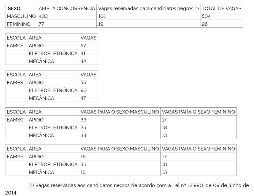 No período de 29 de janeiro a 18 de fevereiro, estarão abertas as inscrições para o concurso público em quatro Escolas de Aprendizes-Marinheiros. O edital foi publicado nesta quinta-feira (14). Estão previstas 480 vagas, 77 das quais para mulheres. Veja o quadro logo abaixo