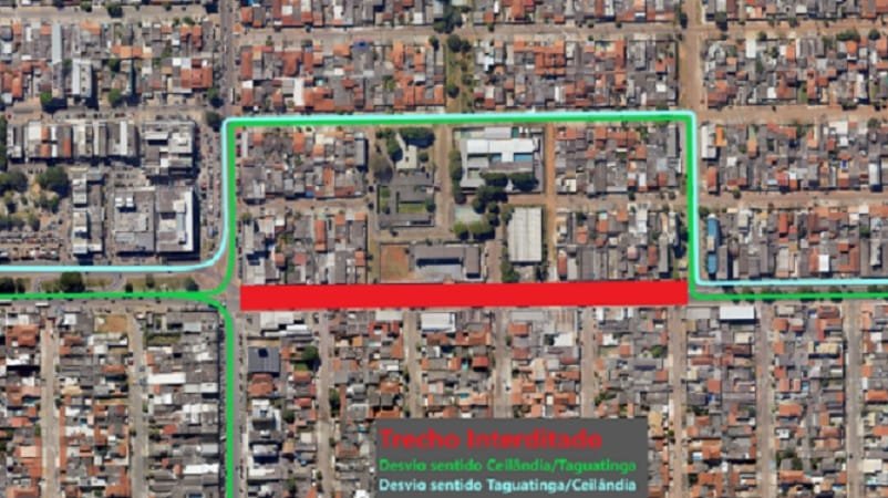A estrada de 7,6 quilômetros, cruza as regiões administrativas de Taguatinga e Ceilândia. Veja o gráfico do desvio que deve ser feito pelos veículos logo abaixo.
