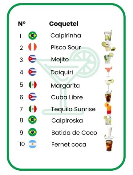 Na quarta colocação está um outro cubano, o daiquiri preparado com rum branco, suco de limão e açúcar. O coquetel mexicano margarita preparado com tequila, suco de limão, licor de laranja e gelo.