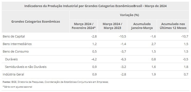 Na série sem ajuste sazonal, no confronto com igual mês do ano anterior, o total da indústria recuou 2,8% em março de 2024, interrompendo sete meses de resultados positivos consecutivos nessa comparação. Nos três primeiros meses de 2024, o setor industrial teve expansão de 1,9%.