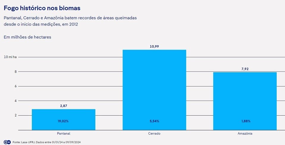 Neste ano, cerca de 21,7 milhões de hectares foram queimados até agopra na Amazônia, no Cerrado e no Pantanal